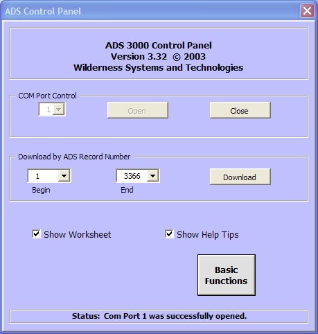 This window is opened by clicking the Advanced Functions button in the main ADS Control Panel window. Advanced functions allow you to change the serial port (COM port) setting and also to focus the download of ADS data to a specific portion of data memory.