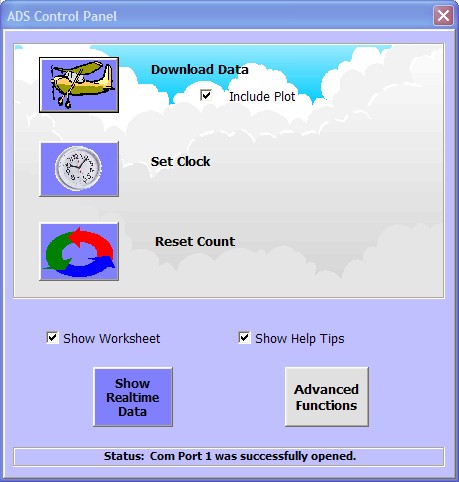 This window is opened by clicking a button in the ADS - Excel spreadsheet that is created when you start the ADS program. The main ADS Control Panel allows you download and plot data, set the system clock, and reset the counter.